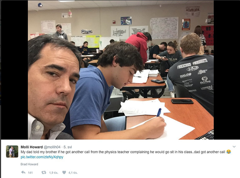 Cijeli sat je sjedio pored sina. „Njegovim kolegama je to bilo super, njemu i ne toliko“, rekao je Brad Howard, koji ima još troje djece. Kako bi dokazao ženi da je ispunio prijetnju, napravio je i selfie. I da stvar bude još neugodnija za Bradleyja, njegova sestra postavila je fotografiju na Twitter.